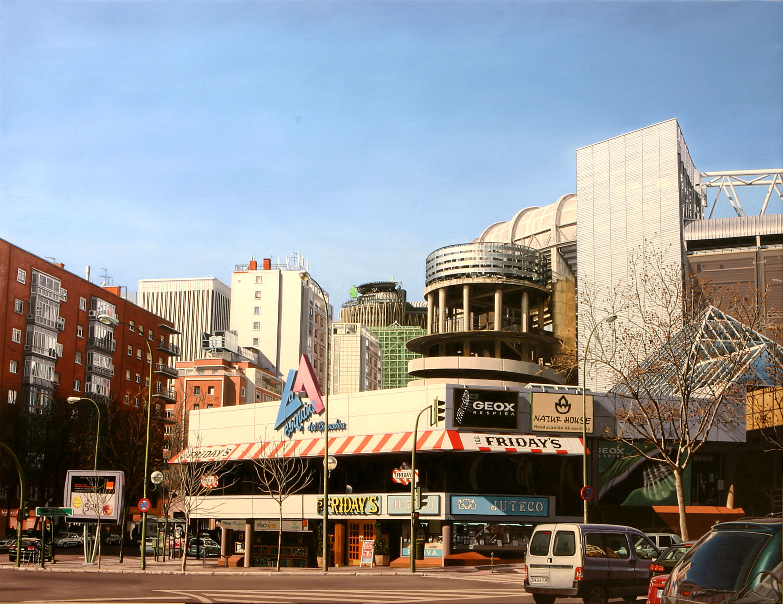 Serrano, Gran Via, Princesa o Goya, plazas como Callao, estaciones como Atocha o Chamartin, además de escenas de la Pasarela Cibeles, el Parque del Retiro o la cafetería Milford, aparecen plasmadas con un hiperrealismo tan preciso que roza la fotografía, convirtiendo su pintura en un manifiesto de la ciudad actual.